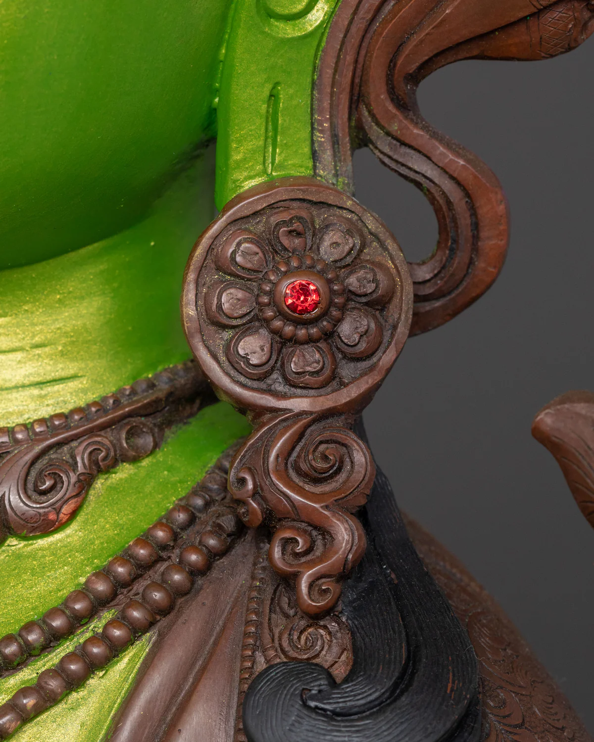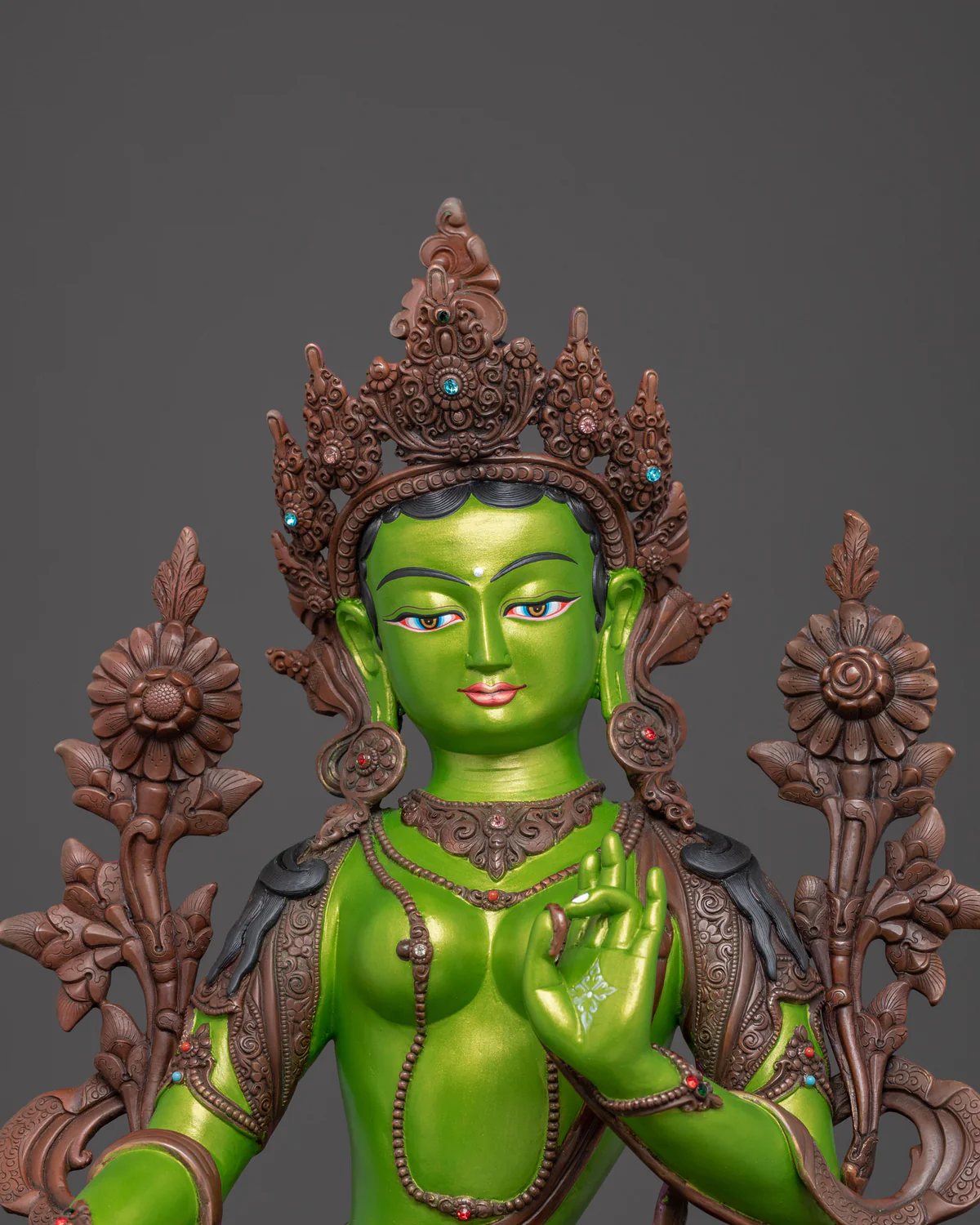 Handcrafted Green Tara statue with an oxidized antique finish, waterproof acrylic body color, and elegant gemstone inlay.