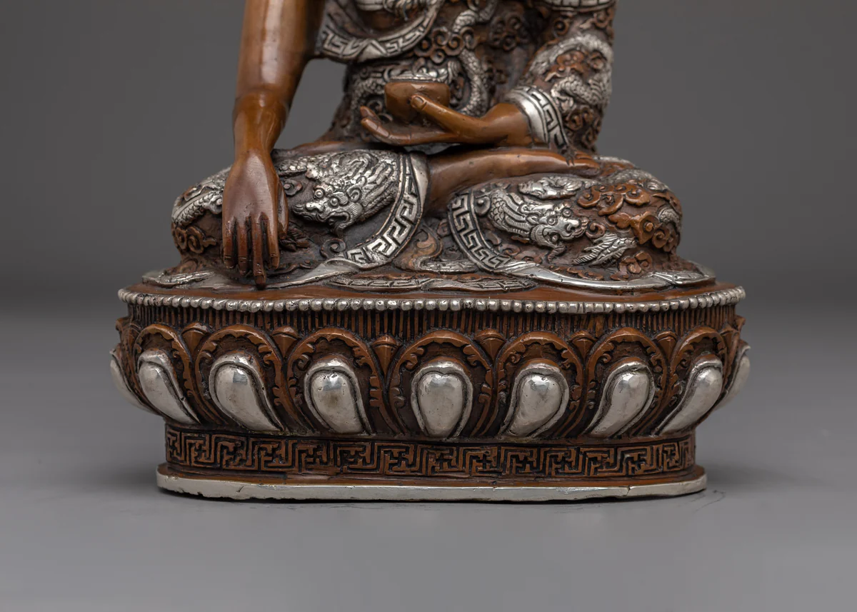 Often depicted seated on a lotus throne with a halo of enlightenment.