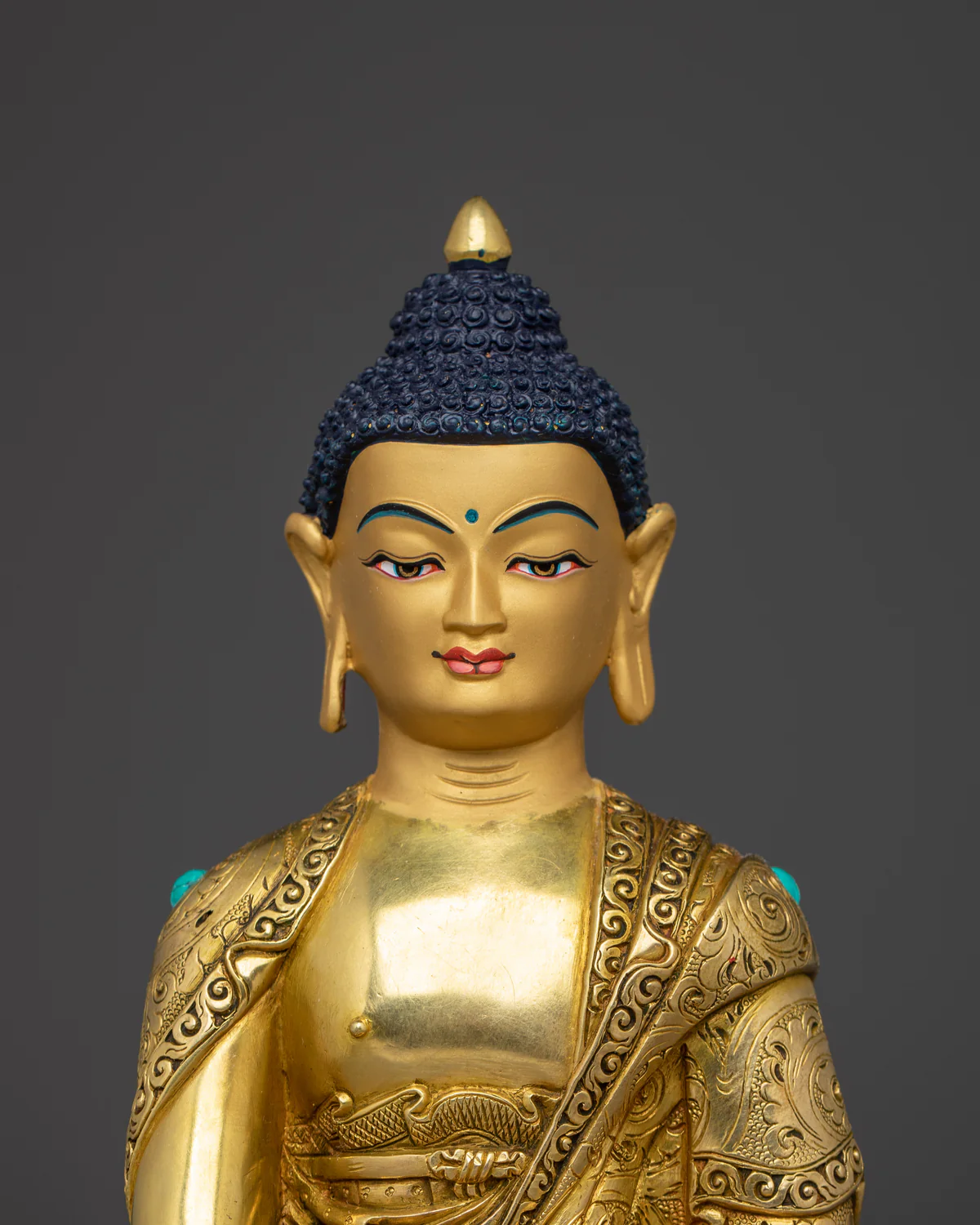 Gold Gilding: The entire statue is richly gilded in 24-karat gold, giving it a glowing, divine presence. Gold symbolizes enlightenment, impermanence, and the noble qualities of a Buddha.