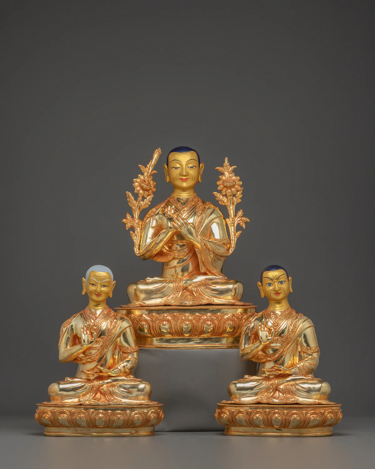 Handcrafted copper Tsongkhapa statue set plated with 24K electro gold, featuring Tsongkhapa and his two main disciples. Smooth, gem-free design with intricate details, symbolizing wisdom, compassion, and spiritual clarity. Ideal for temples, meditation spaces, and devotional altars.
