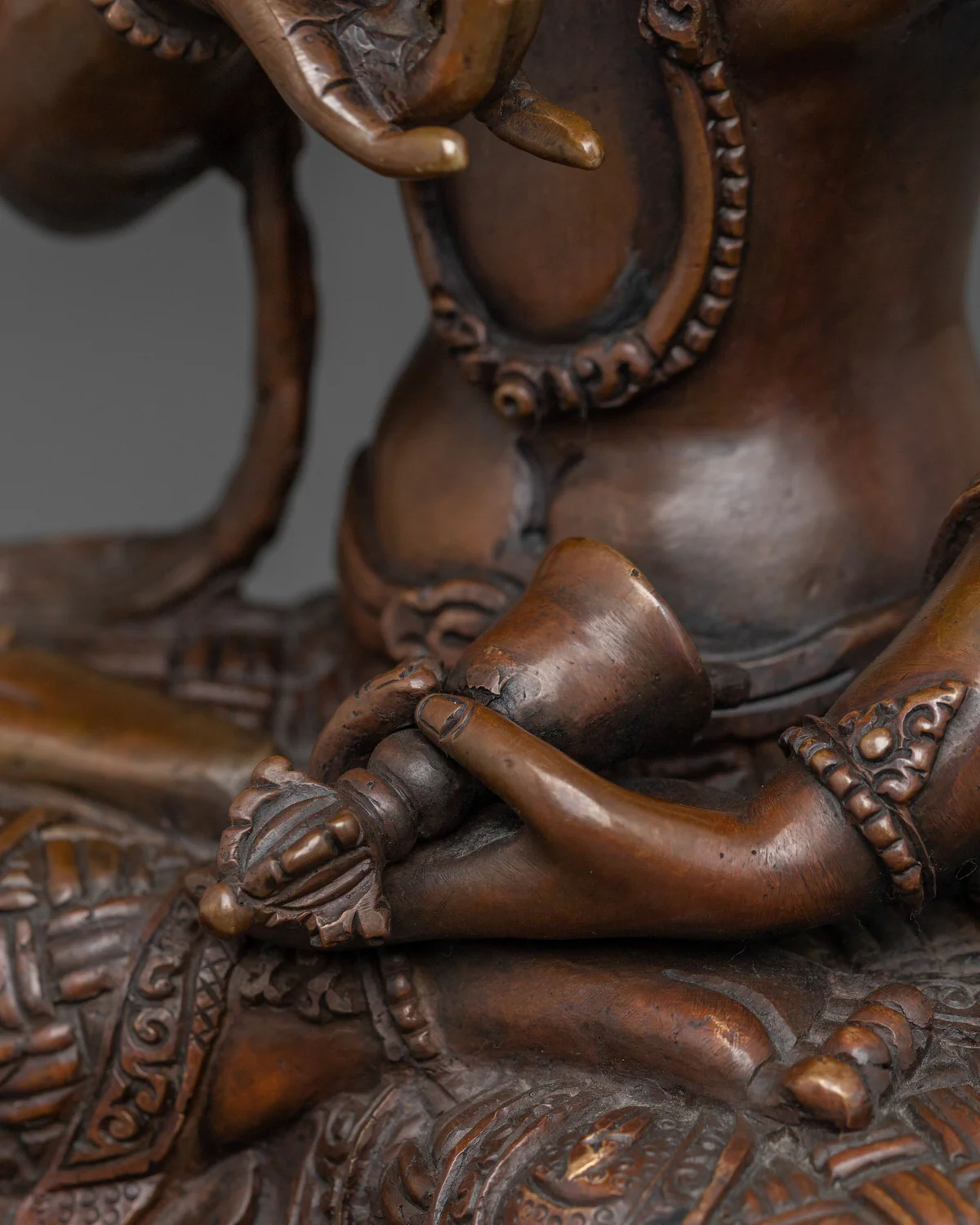 Holds bell (ghanta) in left hand (symbol of wisdom)