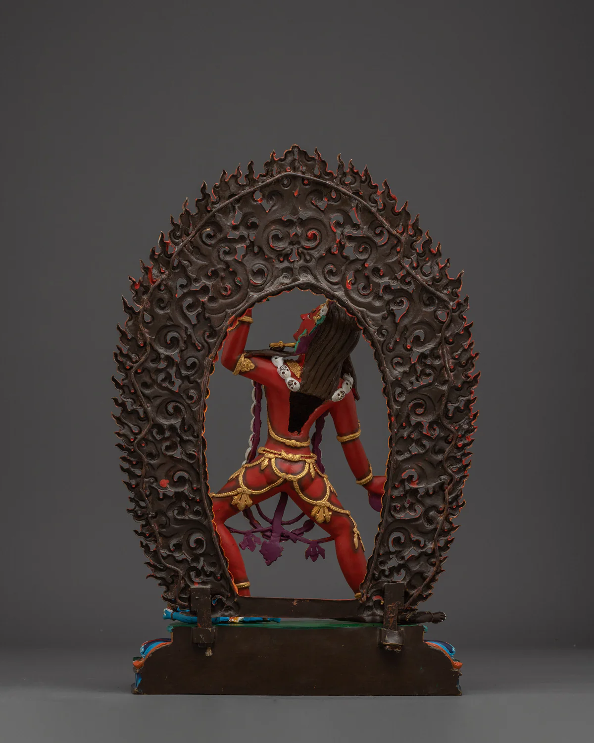 “Featuring the fierce beauty of Vajrayoginī (Dorje Naljorma): our handcrafted red copper statue captures her potent symbolism—the kartika and skull‑cup, flaming halo, youthful posture, and skull-adorned crown—all rendered in exquisite relief. An auspicious piece radiating transformation, wisdom, and compassion.”