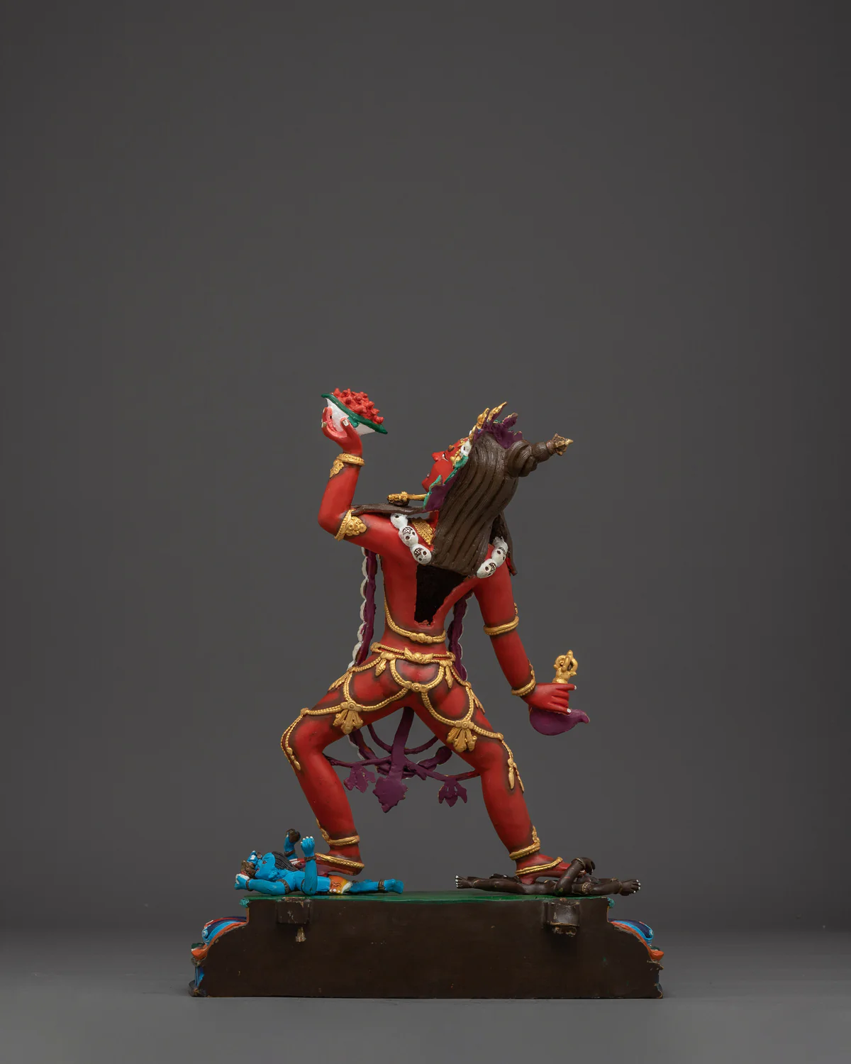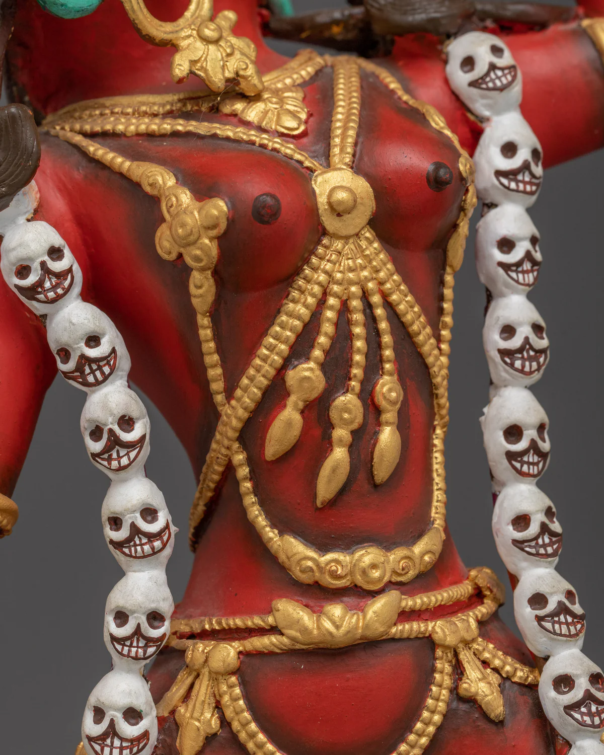 Skull crown & necklace: she wears five prominently visible skulls (first five of the six perfections) and often a garland of fifty smaller skulls, symbolizing perfection and the death-to-rebirth transformation dakinitranslations.com+3Dharma Sculpture+3Wikipedia+3.